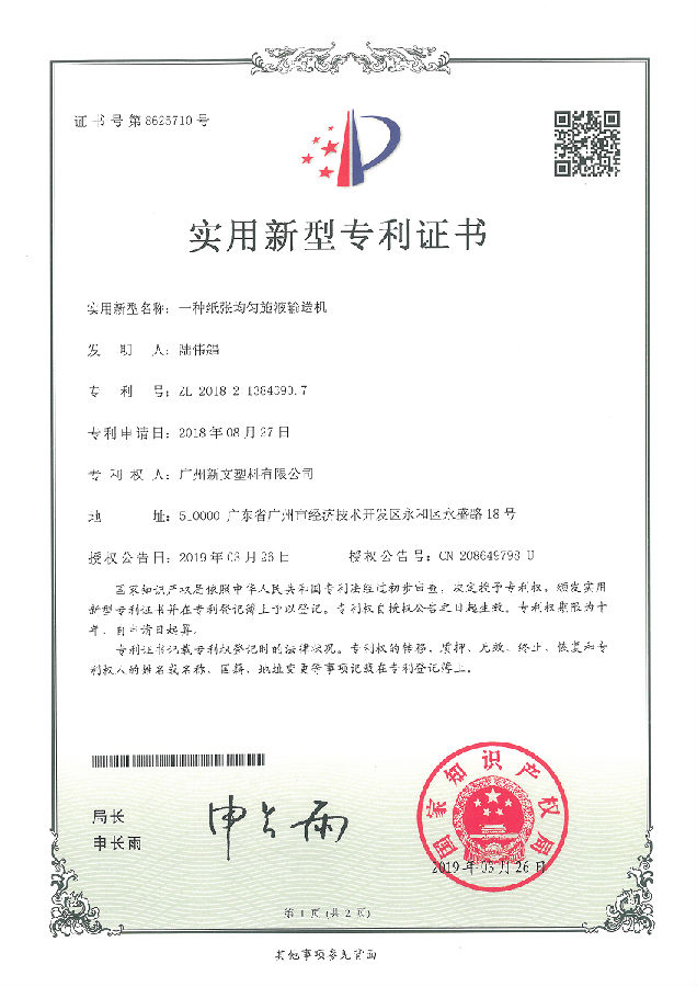 201821384390.7 一種紙張均勻施液輸送機廣州新文塑料有限公司