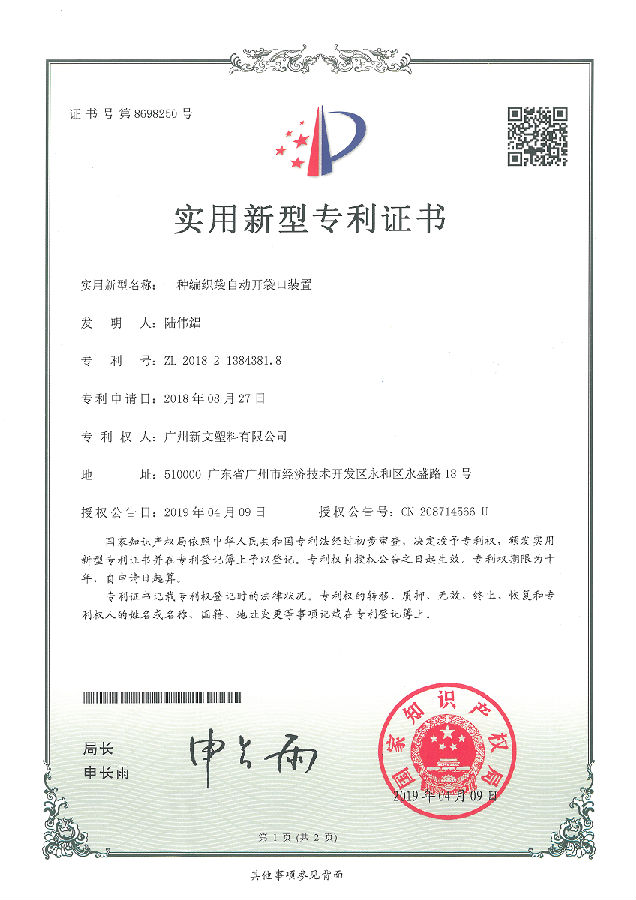 201821384381.8 一種編織袋自動開袋口裝置廣州新文塑料有限公司